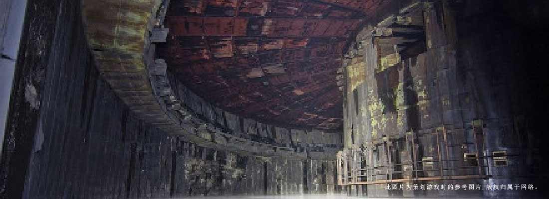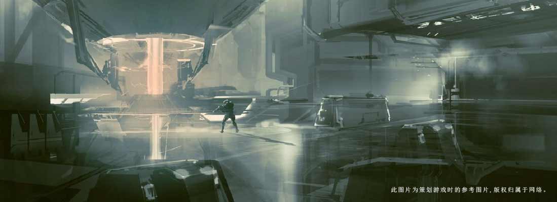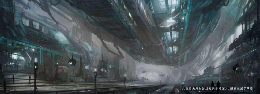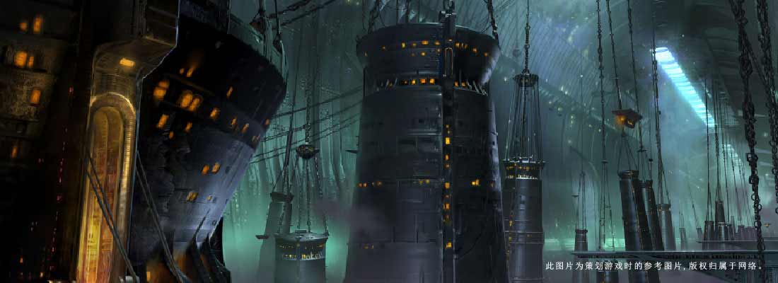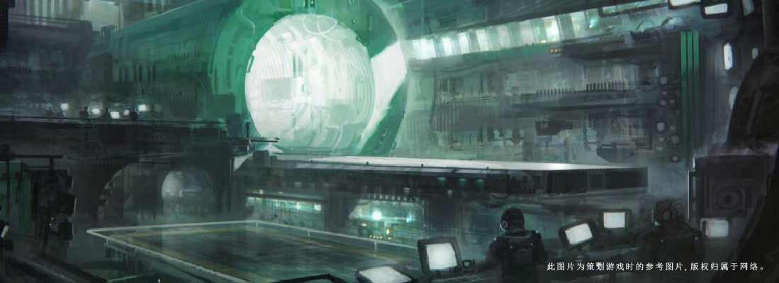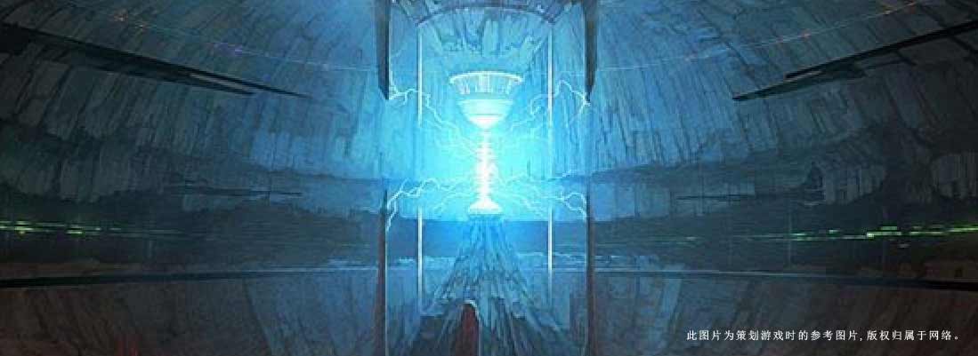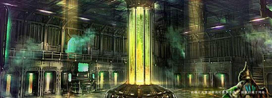 被各个方位走廊连接到的大厅,大厅中央有一座大型的能量装置插天际。场景上放置着运输的货物和运送货物用的车辆。大厅各方的通道被大闸封锁起来,能量装置貌似受到了什么刺激,大量放射着光芒,四周墙上和车辆本来暗淡灯光扩大照亮各处。