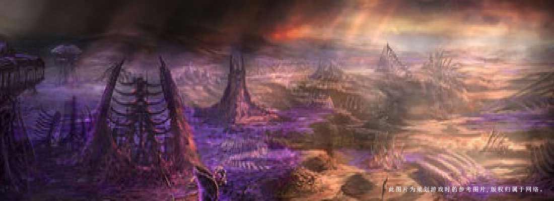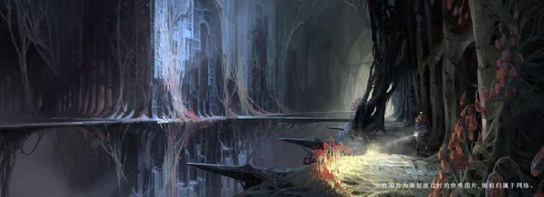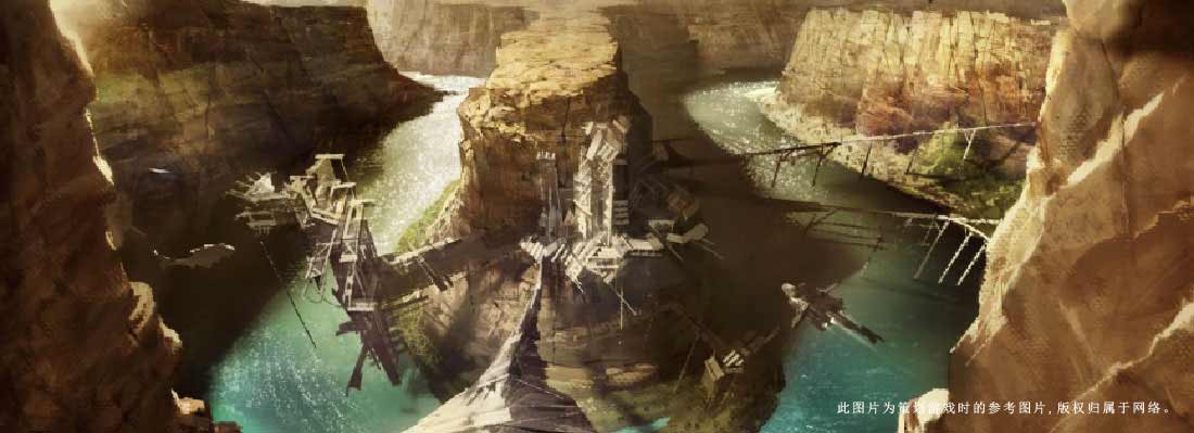 在一个颜色怪异的异星山谷中,层层叠叠的岩石,峭直的岩石壁,一些能够立足的岩石柱,远处有一座巨大的人类建筑物,并且有许多奇奇怪怪的类似蘑菇的伞状植物,和一些喜欢潮湿环境的苔藓之类的植物,岩石要表现的比较湿滑。总体上是一个环境阴暗潮湿的,色彩又比较丰富的场景。