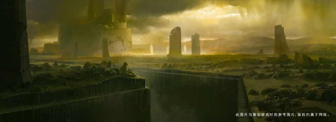 废弃的殖民城市里,依稀可以看到以前的种种印记,废弃的宇宙飞船,被当地星球环境吞没的殖民基地,这里会有一些人类遗留下来的各种旧物品,种植过植物的养殖槽,一些被环境侵蚀的生活设施。总体是没有维护的人工设施像是生长一般的出现在殖民星球的自然环境中,营造一种静谧的,风儿对时间倾诉故事的感觉。