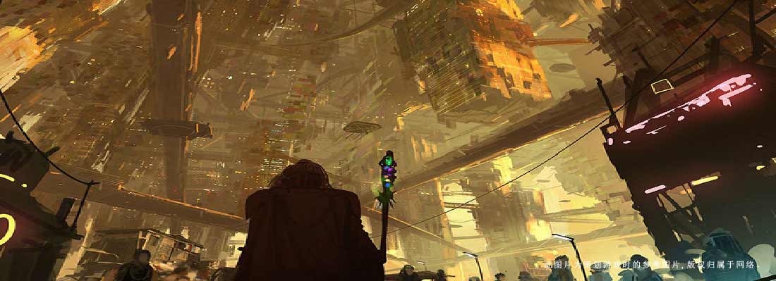 各种悬在空中的金属建筑,密集的拥挤在一起,是一个未来的贫民窟形象。