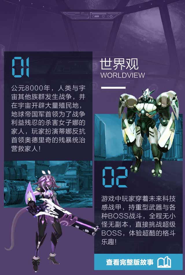 公元8000年,人类与宇宙其他族群发生战争,并在宇宙开辟大量殖民地,地球帝国军首领为了战争利益残忍的杀害女子蒂娜的家人,玩家扮演蒂娜反抗首领奥德里奇的残暴统治营救家人!
