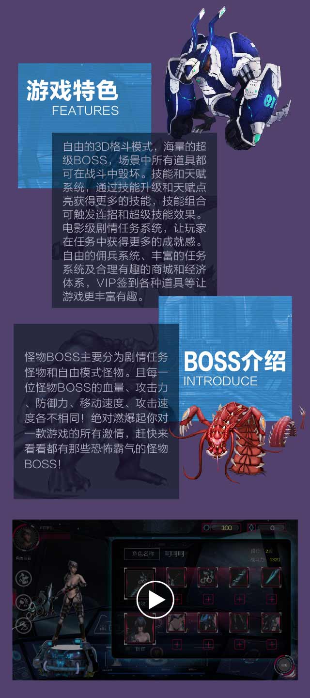 游戏中玩家穿着未来科技感战甲,持重型武器与各种BOSS战斗,全程无小怪无副本,直接挑战超级BOSS,体验超酷的格斗乐趣!