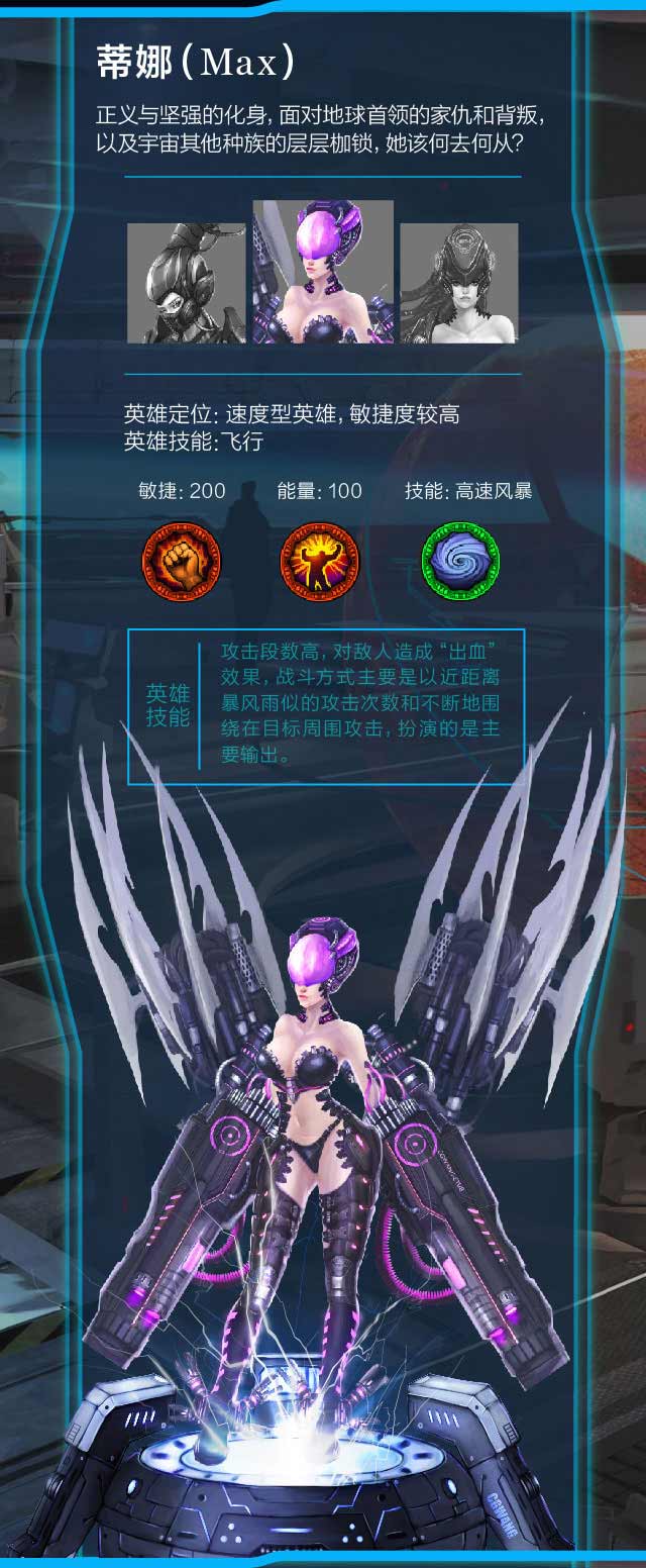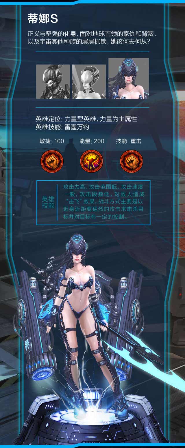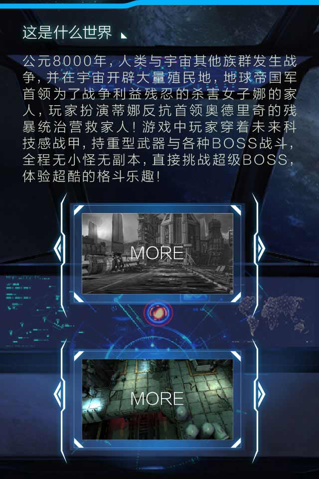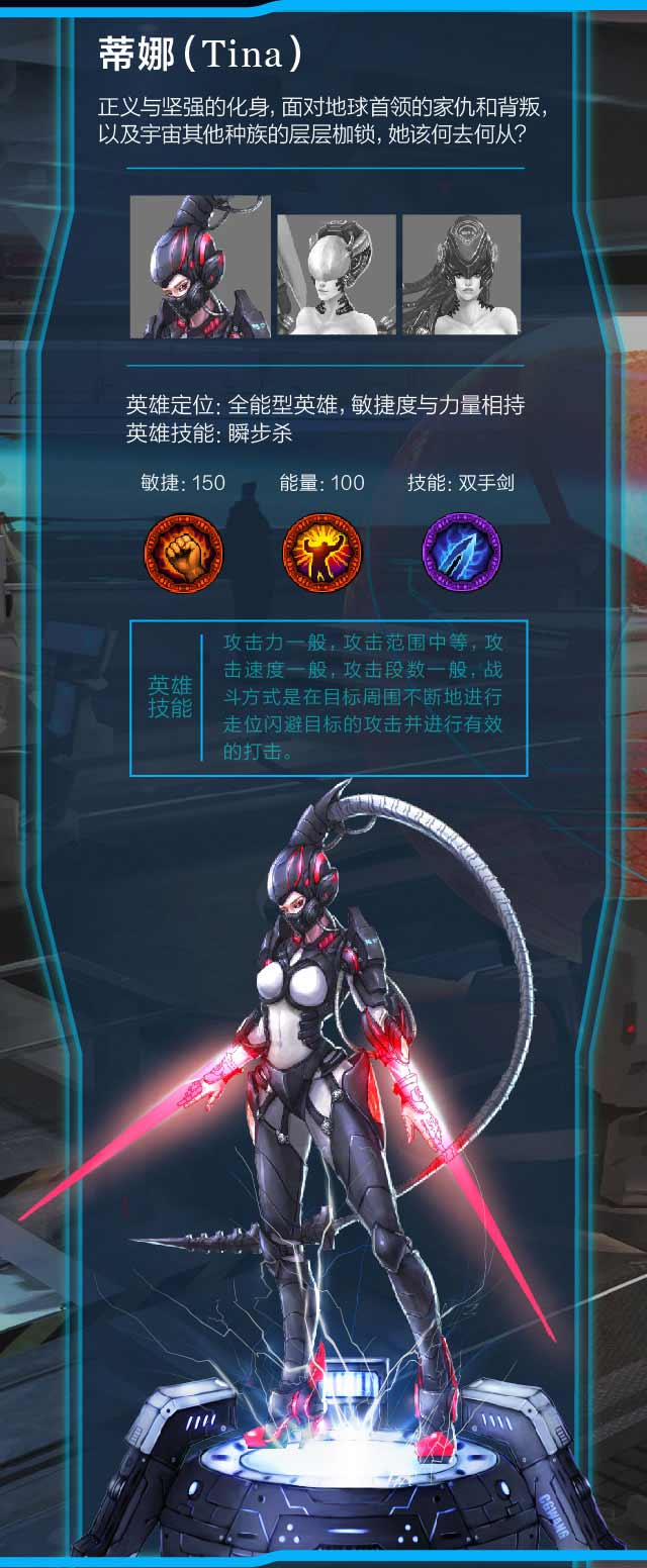公元8000年,人类与宇宙其他族群发生战争,并在宇宙开辟大量殖民地,地球帝国军首领为了战争利益残忍的杀害女子娜的家人,玩家扮演蒂娜反抗首领奥德里奇的残暴统治营救家人!游戏中玩家穿着未来科技感战甲,持重型武器与各种BOSS战斗,全程无小怪无副本,直接挑战超级BOSS,体验超酷的格斗乐趣!